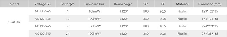 Specification of Boxster LED Panel Light: