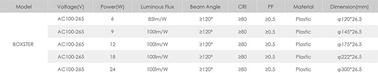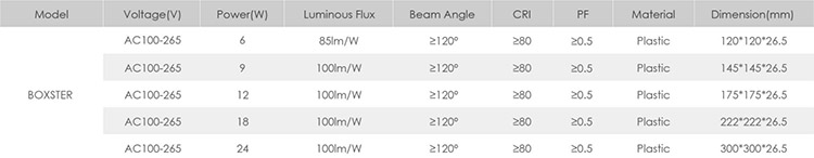 specification of Boxster LED Panel Light: