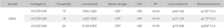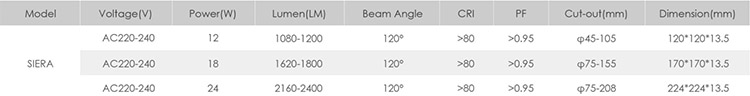 Specification of Siera LED Panel Light: